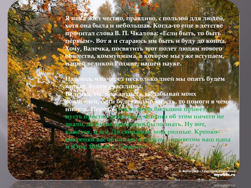 Валечка, ты, пожалуйста, не забывай моих родителей, если будет возможность, то помоги в чем-нибудь. Передай им от меня большой привет, и пусть простят меня за то, что они об этом ничего не знали, да им не положено было знать. Ну вот, кажется, и все. До свидания, мои родные. Крепко- накрепко вас обнимаю и целую, с приветом ваш папа и Юра. 10.04.61 г. Гагарин»