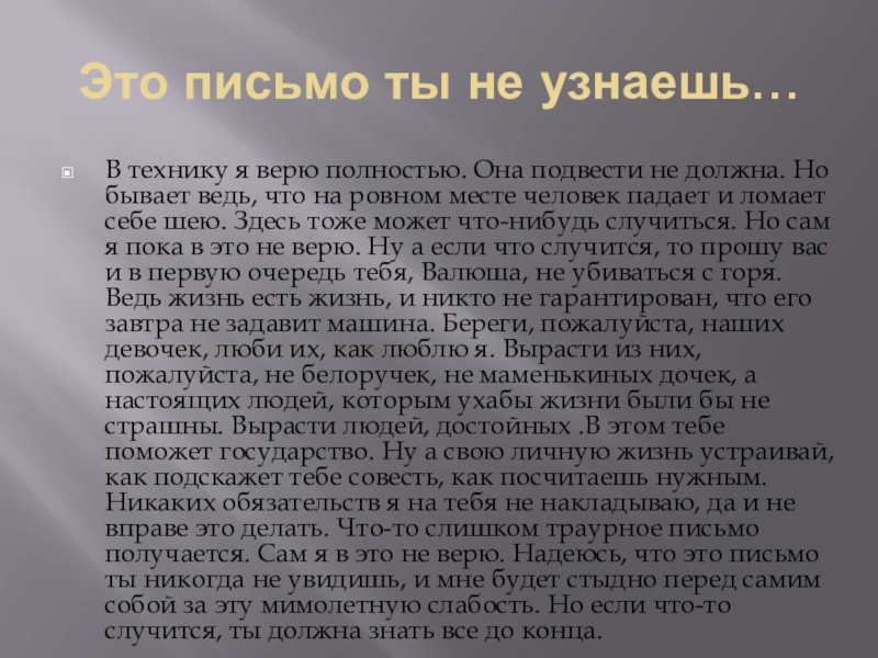 Он знал, что ему предстоит очень опасное мероприятие, риск для жизни был очень велик. Вот это письмо:
