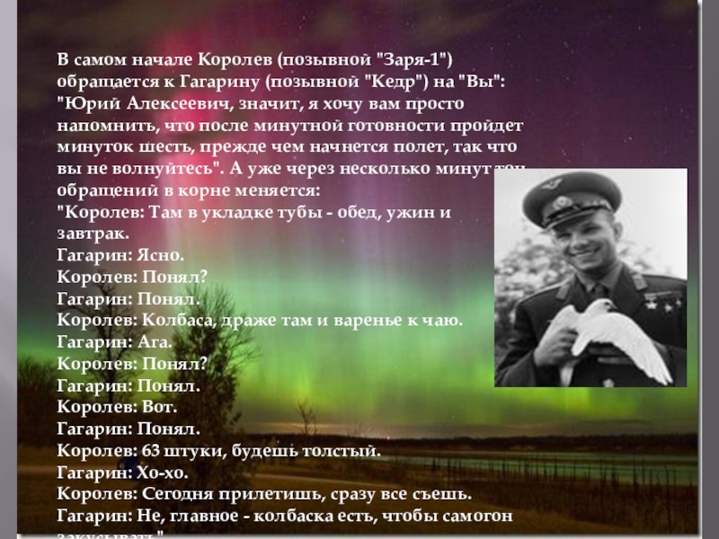 Слайд 5В самом начале Королев (позывной "Заря-1") обращается к Гагарину (позывной "Кедр")