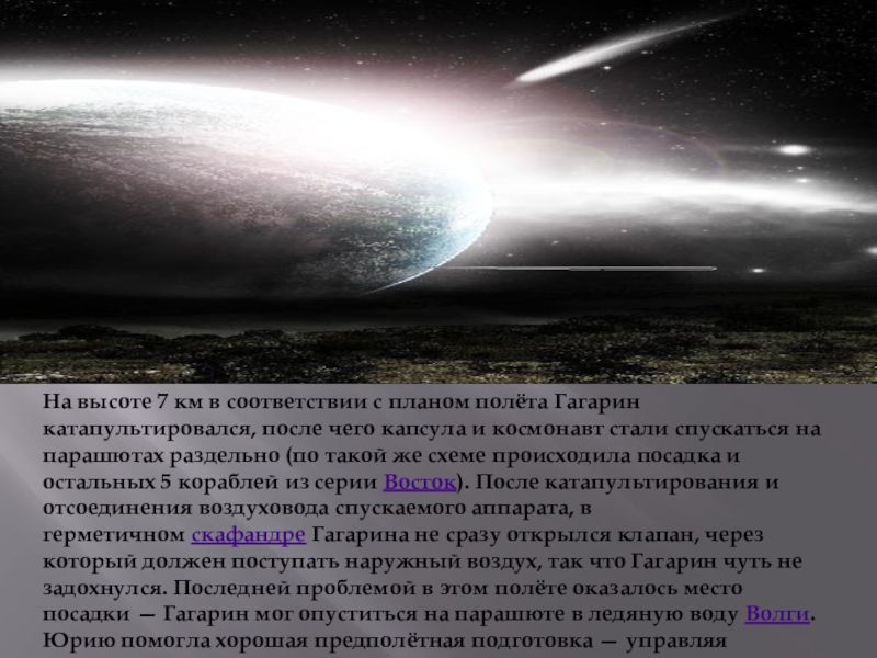 Слайд 11На высоте 7 км в соответствии с планом полёта Гагарин катапультировался, после