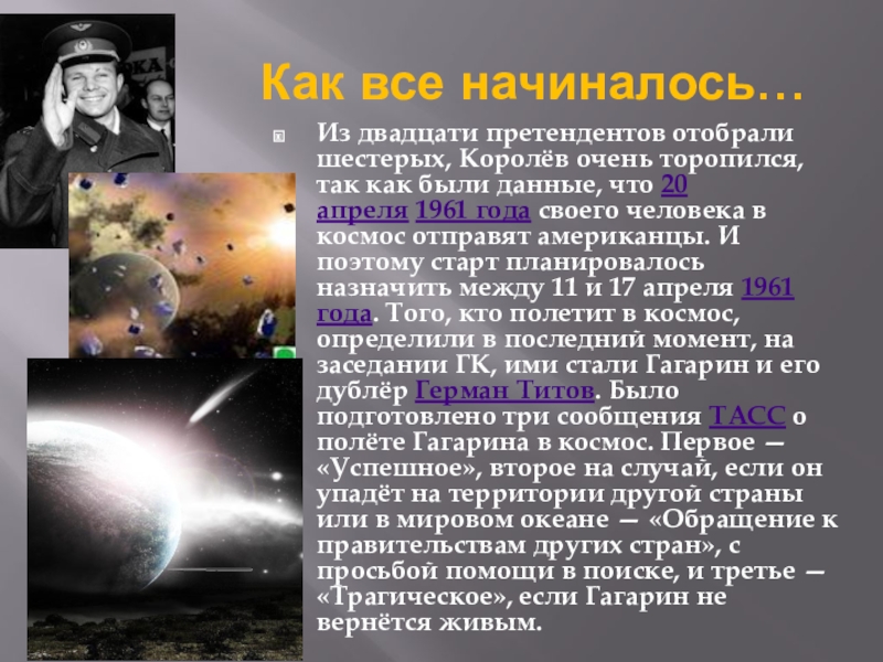 как были данные, что 20 апреля 1961 года своего человека в космос отправят американцы. И поэтому старт планировалось назначить между 11 и 17 апреля 1961 года. Того, кто полетит в космос, определили в последний момент, на заседании ГК, ими стали Гагарин и его дублёр Герман Титов. Было подготовлено три сообщения ТАСС о полёте Гагарина в космос. Первое — «Успешное», второе на случай, если он упадёт на территории другой страны или в мировом океане — «Обращение к правительствам других стран», с просьбой помощи в поиске, и третье — «Трагическое», если Гагарин не вернётся живым.