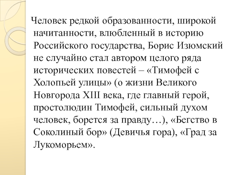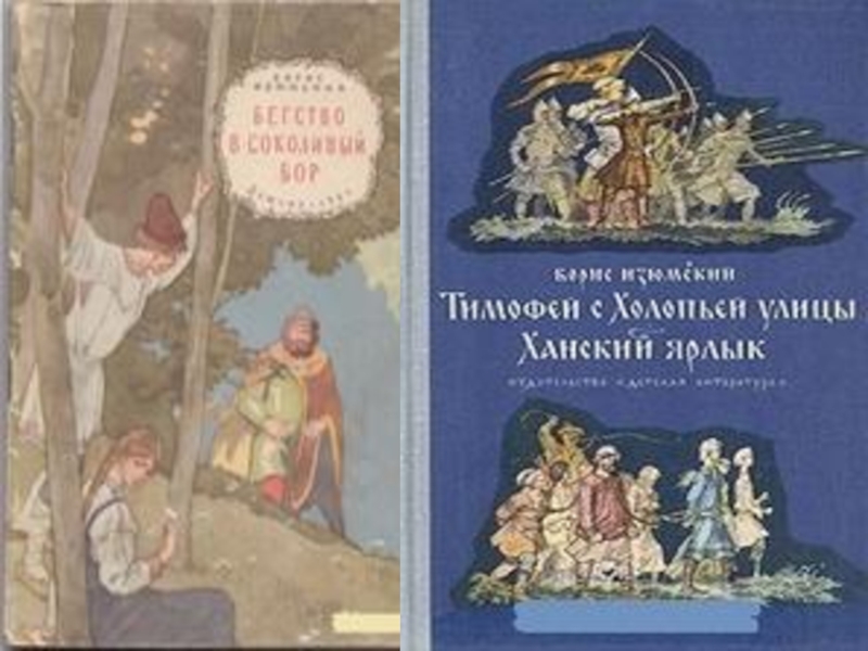 Борис Изюмский не случайно стал автором целого ряда исторических повестей – «Тимофей с Холопьей улицы» (о жизни Великого Новгорода XIII века, где главный герой, простолюдин Тимофей, сильный духом человек, борется за правду…), «Бегство в Соколиный бор» (Девичья гора), «Град за Лукоморьем».