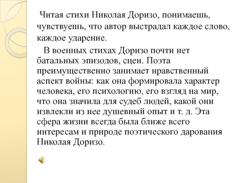 В военных стихах Доризо почти нет батальных эпизодов, сцен. Поэта преимущественно занимает нравственный аспект войны: как она формировала характер человека, его психологию, его взгляд на мир, что она значила для судеб людей, какой они извлекли из нее душевный опыт и т. д. Эта сфера жизни всегда была ближе всего интересам и природе поэтического дарования Николая Доризо.