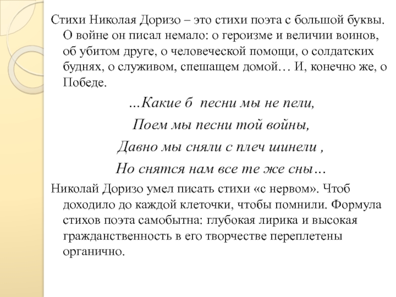 Слайд 14Стихи Николая Доризо – это стихи поэта с большой буквы. О