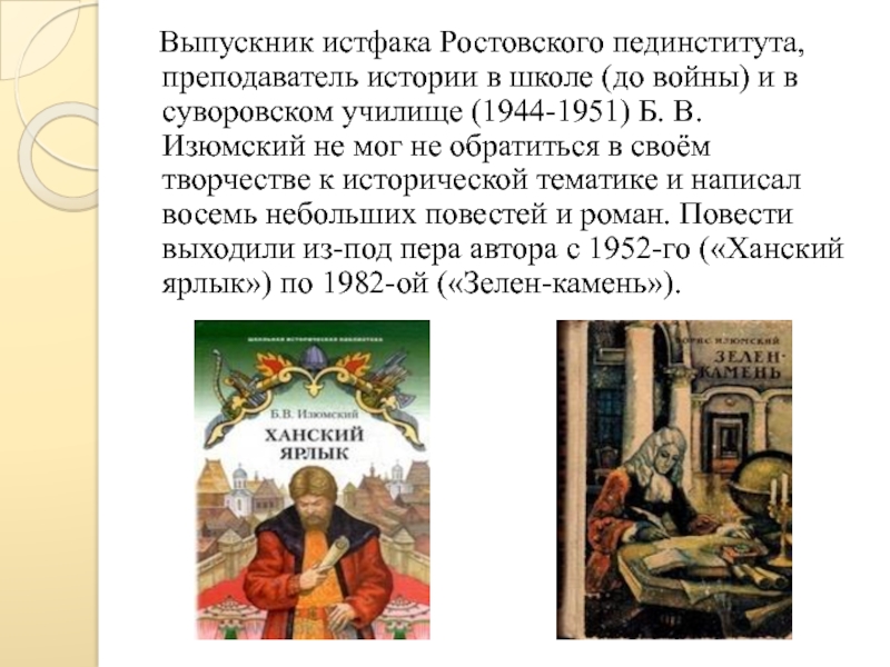 войны) и в суворовском училище (1944-1951) Б. В. Изюмский не мог не обратиться в своём творчестве к исторической тематике и написал восемь небольших повестей и роман. Повести выходили из-под пера автора с 1952-го («Ханский ярлык») по 1982-ой («Зелен-камень»).