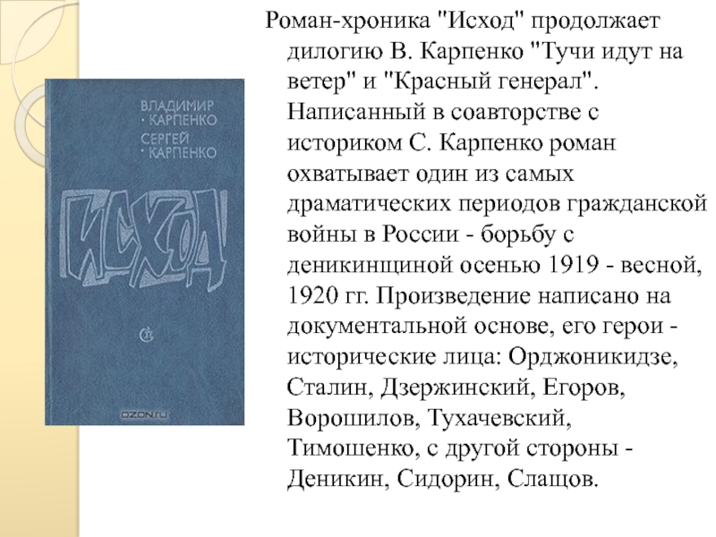Слайд 5Роман-хроника "Исход" продолжает дилогию В. Карпенко "Тучи идут на ветер" и