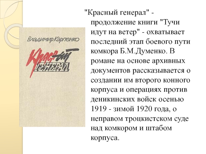 "Красный генерал". Написанный в соавторстве с историком С. Карпенко роман охватывает один из самых драматических периодов гражданской войны в России - борьбу с деникинщиной осенью 1919 - весной, 1920 гг. Произведение написано на документальной основе, его герои - исторические лица: Орджоникидзе, Сталин, Дзержинский, Егоров, Ворошилов, Тухачевский, Тимошенко, с другой стороны - Деникин, Сидорин, Слащов.