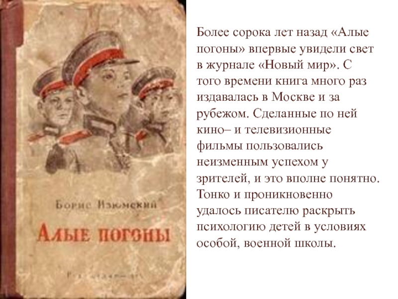 «Новый мир». С того времени книга много раз издавалась в Москве и за рубежом. Сделанные по ней кино– и телевизионные фильмы пользовались неизменным успехом у зрителей, и это вполне понятно. Тонко и проникновенно удалось писателю раскрыть психологию детей в условиях особой, военной школы.