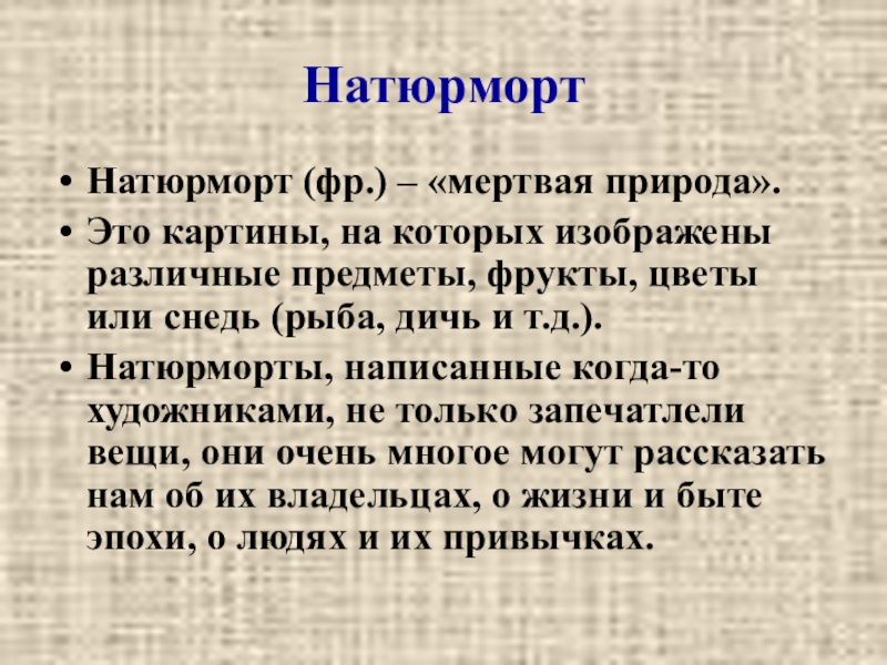 НатюрмортНатюрморт (фр.) – «мертвая природа».Это картины, на которых изображены различные предметы, фрукты, цветы или снедь (рыба, дичь