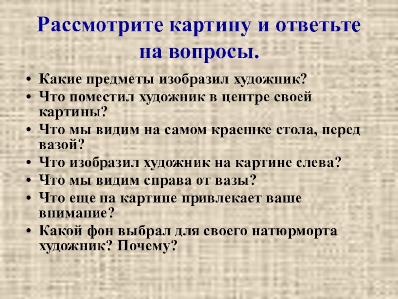 Рассмотрите картину и ответьте на вопросы.Какие предметы изобразил художник?Что поместил художник в центре своей картины?Что мы видим