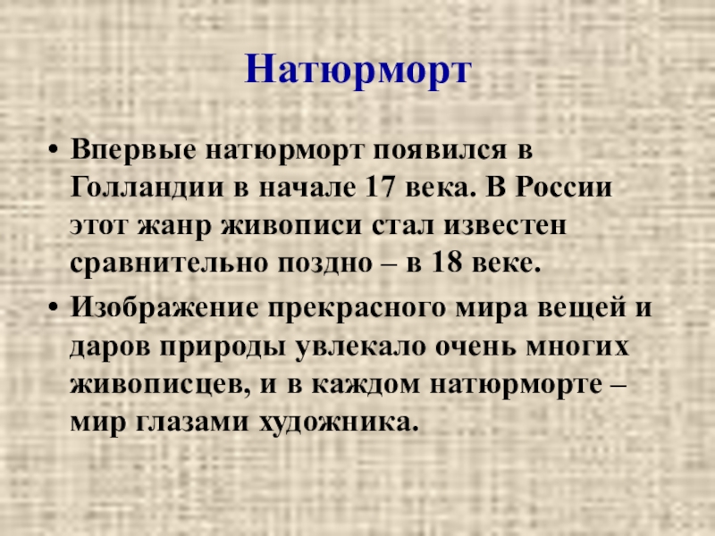 НатюрмортВпервые натюрморт появился в Голландии в начале 17 века. В России этот жанр живописи стал известен сравнительно