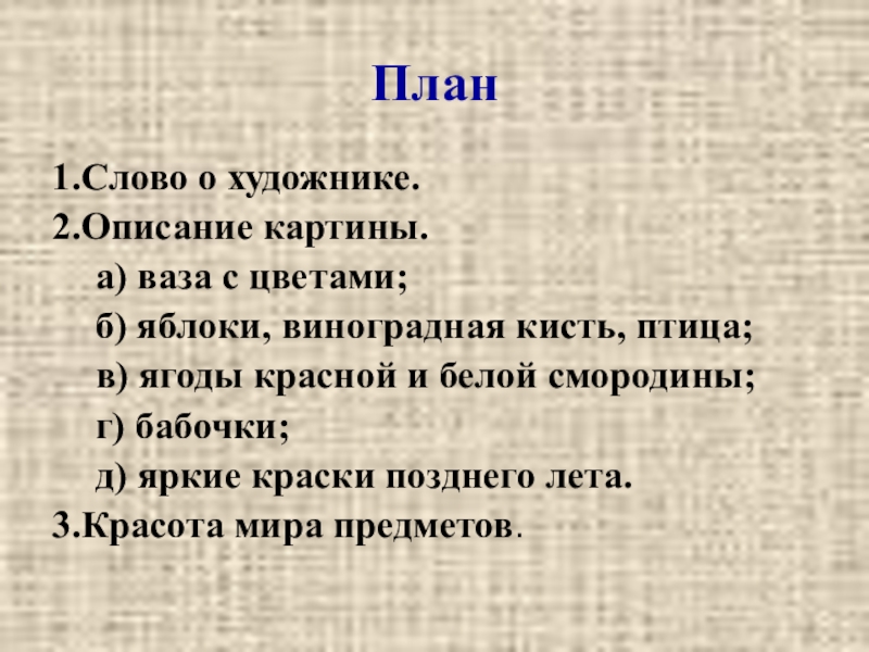 План1.Слово о художнике.2.Описание картины.	а) ваза с цветами;	б) яблоки, виноградная кисть, птица;	в) ягоды красной и белой смородины;	г) бабочки;	д)
