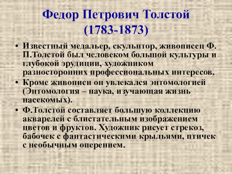 Федор Петрович Толстой  (1783-1873)Известный медальер, скульптор, живописец Ф.П.Толстой был человеком большой культуры и глубокой эрудиции, художником