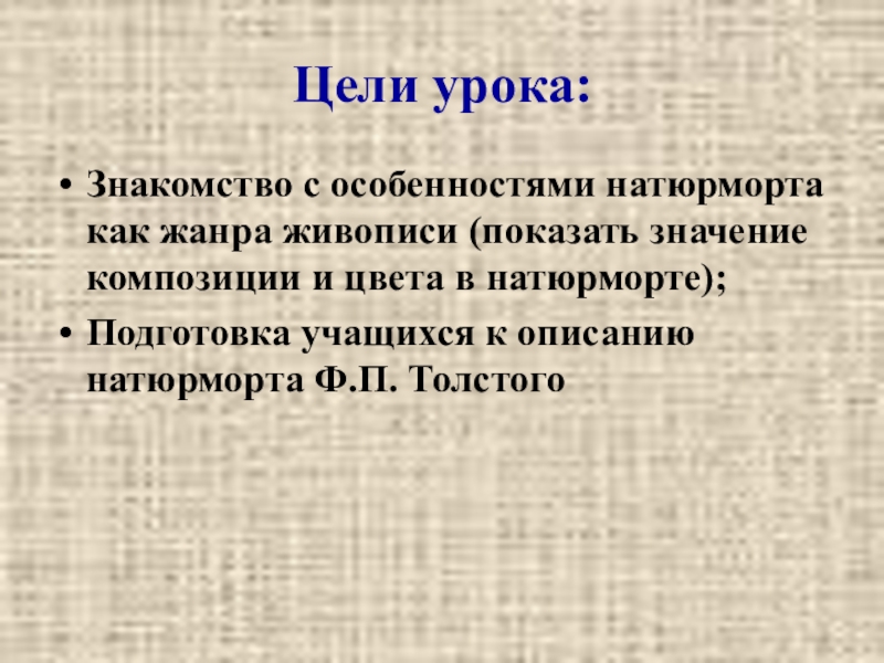 Цели урока:Знакомство с особенностями натюрморта как жанра живописи (показать значение композиции и цвета в натюрморте);Подготовка учащихся к описанию натюрморта Ф.П. Толстого