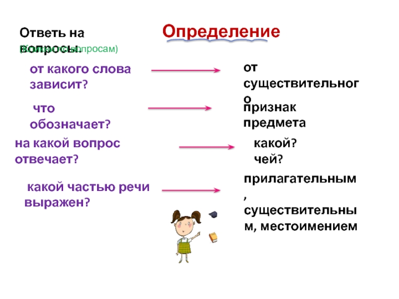 - Найдите слова, которые зависит от существительного, обозначают признак предмета, отвечает на вопрос какой? какая? выражены именем прилагательным.