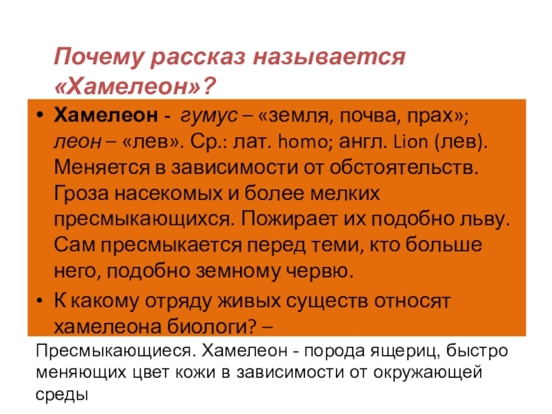 леон – «лев». Ср.: лат. homo; англ. Lion (лев). Меняется в зависимости от обстоятельств. Гроза насекомых и более мелких пресмыкающихся. Пожирает их подобно льву. Сам пресмыкается перед теми, кто больше него, подобно земному червю.