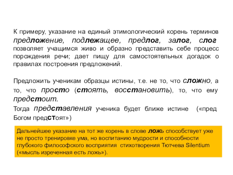 Дальнейшее указание на тот же корень в слове ложь способствует уже не просто тренировке ума, но воспитанию мудрости и способности глубокого философского восприятия стихотворения Тютчева Silentium («мысль изреченная есть ложь»).