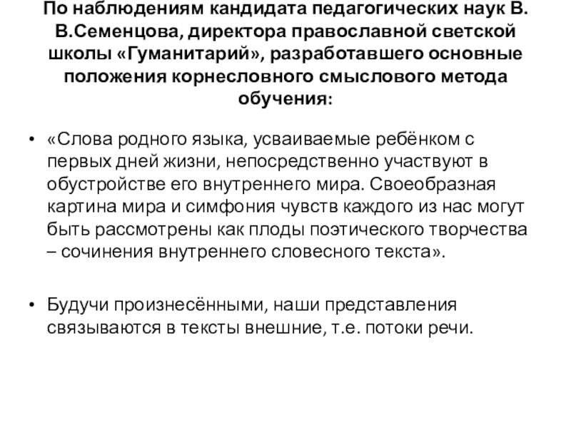 Слайд 7По наблюдениям кандидата педагогических наук В.В.Семенцова, директора православной светской школы «Гуманитарий»,