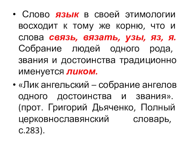 что и слова связь, вязать, узы, яз, я. Собрание людей одного рода, звания и достоинства традиционно именуется ликом.