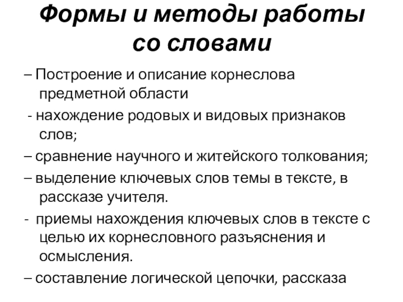 - приемы нахождения ключевых слов в тексте с целью их корнесловного разъяснения и осмысления.