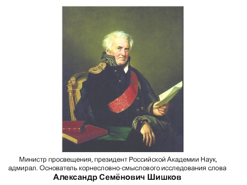 Слайд 2 Министр просвещения, президент Российской Академии Наук, адмирал. Основатель корнесловно-смыслового исследования