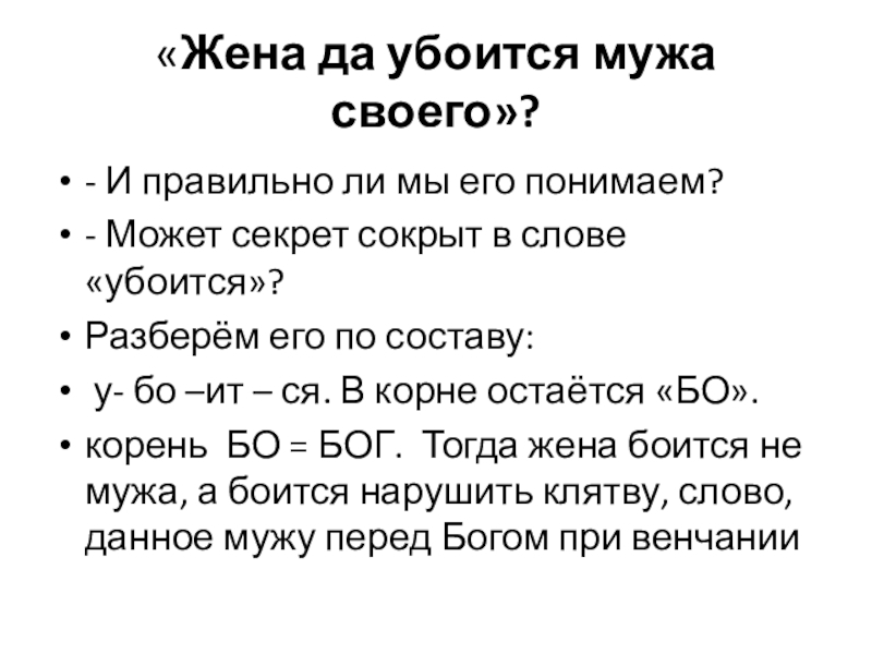 корень БО = БОГ. Тогда жена боится не мужа, а боится нарушить клятву, слово, данное мужу перед Богом при венчании