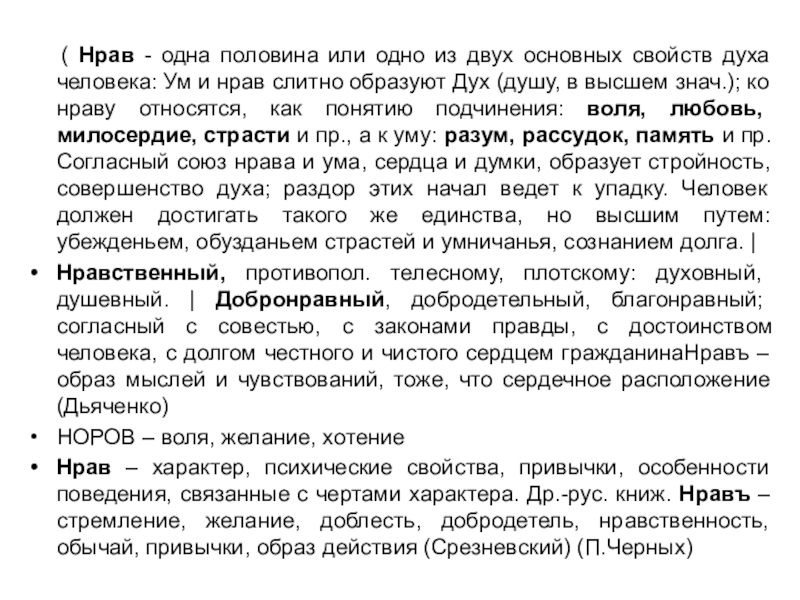 Нравственный, противопол. телесному, плотскому: духовный, душевный. | Добронравный, добродетельный, благонравный; согласный с совестью, с законами правды, с достоинством человека, с долгом честного и чистого сердцем гражданинаНравъ – образ мыслей и чувствований, тоже, что сердечное расположение (Дьяченко)