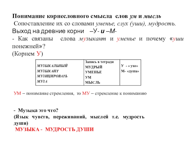 Слайд 25Понимание корнесловного смысла слов ум и мысль