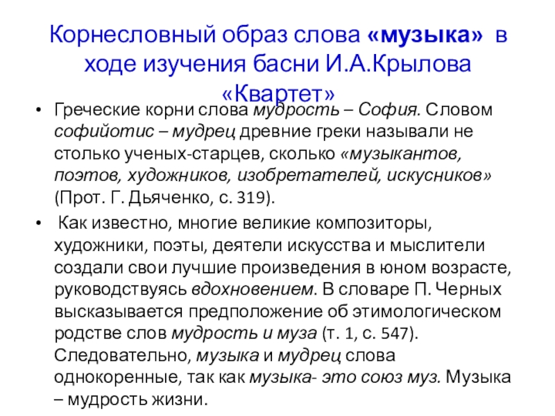 Слайд 24Корнесловный образ слова «музыка» в ходе изучения басни И.А.Крылова «Квартет»