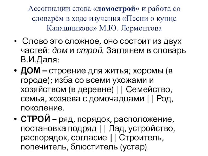 Слайд 20Ассоциации слова «домострой» и работа со словарём в ходе изучения «Песни