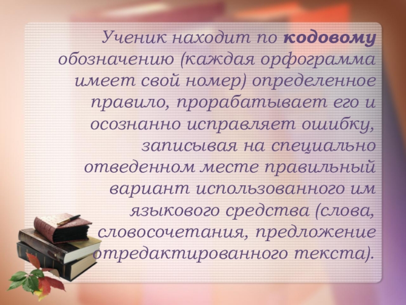 Ученик находит по кодовому обозначению (каждая орфограмма имеет свой номер) определенное правило, прорабатывает