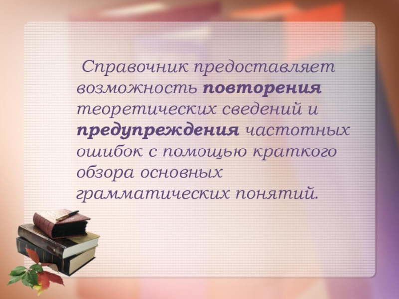 Слайд 6 Справочник предоставляет возможность повторения теоретических сведений и предупреждения