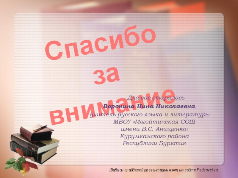 Шаблон слайдовой презентации взят на сайте Pedsovet.suСпасибо за внимание    Для вас старалась Воронина Нина