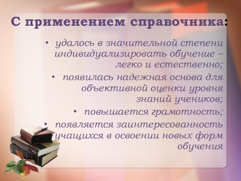 С применением справочника: удалось в значительной степени индивидуализировать обучение – легко и естественно; появилась надежная основа для