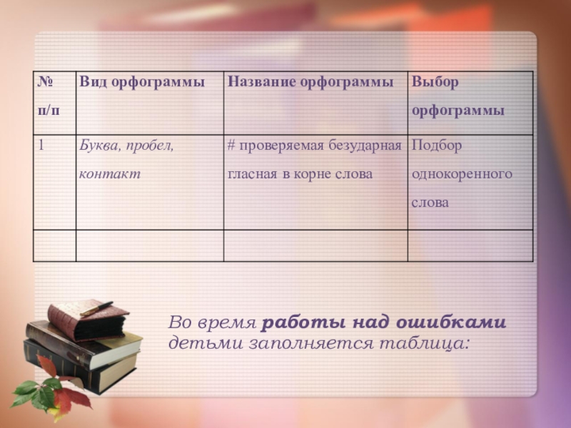 Слайд 8Во время работы над ошибками детьми заполняется таблица: