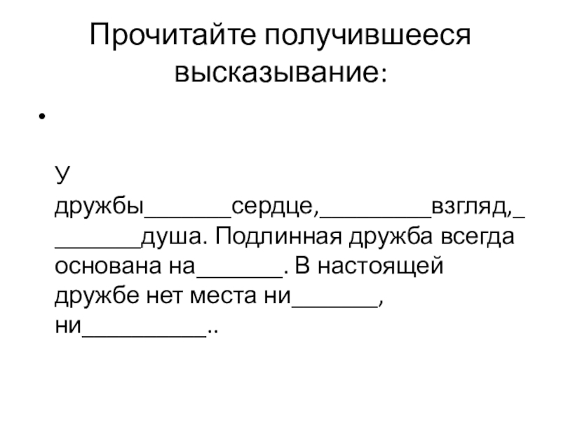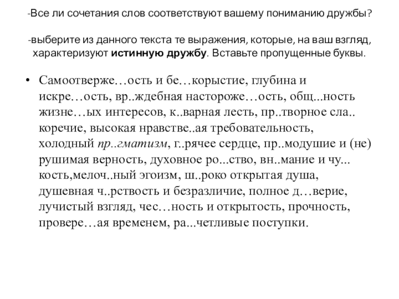 Самоотверже…ость и бе…корыстие, глубина и искре…ость, вр..ждебная настороже…ость, общ...ность жизне…ых интересов, к..варная лесть, пр..творное сла..коречие, высокая нравстве..ая требовательность, холодный пр..гматизм, г..рячее сердце, пр..модушие и (не)рушимая верность, духовное ро...ство, вн..мание и чу...кость,мелоч..ный эгоизм, ш..роко открытая душа, душевная ч..рствость и безразличие, полное д…верие, лучистый взгляд, чес…ность и открытость, прочность, провере…ая временем, ра...четливые поступки.
