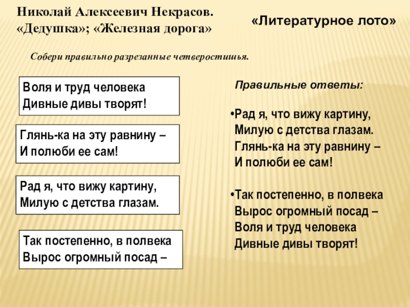 Собери правильно разрезанные четверостишья.