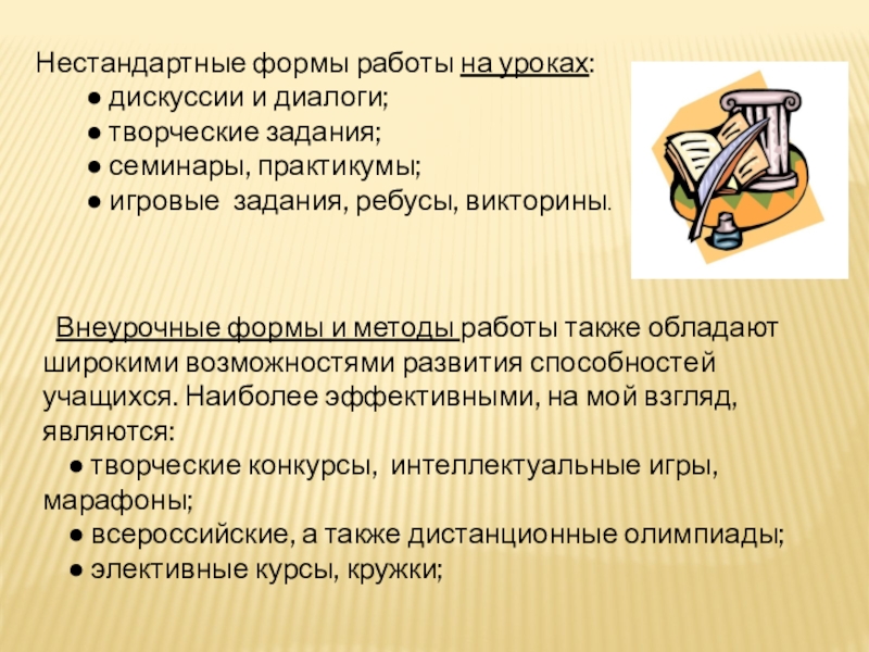 Внеурочные формы и методы работы также обладают широкими возможностями развития способностей учащихся. Наиболее эффективными, на мой взгляд, являются: