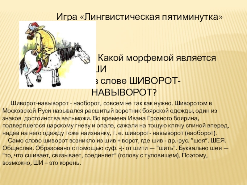 Шиворот-навыворот - наоборот, совсем не так как нужно. Шиворотом в Московской Руси назывался расшитый воротник боярской одежды, один из знаков достоинства вельможи. Во времена Ивана Грозного боярина, подвергшегося царскому гневу и опале, сажали на тощую клячу спиной вперед, надев на него одежду тоже наизнанку, т. е. шиворот- навыворот (наоборот).