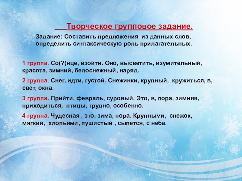 4 группа. Чудесная , это, зима, пора. Крупными, снежок, мягкий, хлопьями, пушистый , сыпется, с неба.