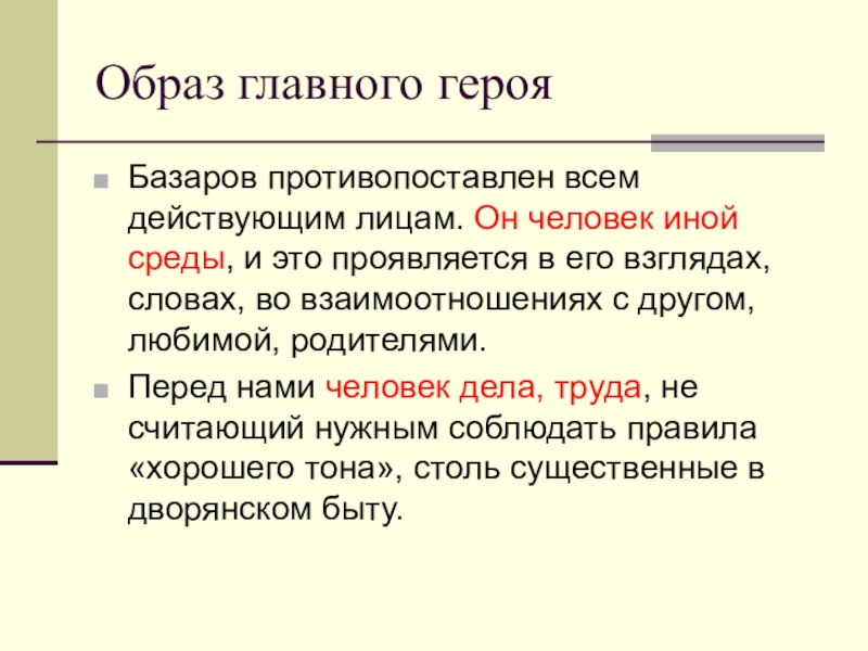 духовной и физической деятельности Базарова, его отношению к людям, миру.