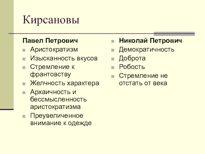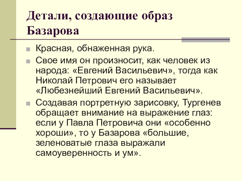 Создавая портретную зарисовку, Тургенев обращает внимание на выражение глаз: если у Павла Петровича они «особенно хороши», то у Базарова «большие, зеленоватые глаза выражали самоуверенность и ум».