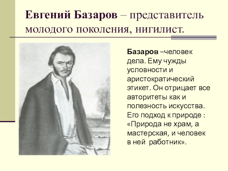 Слайд 21Евгений Базаров – представитель молодого поколения, нигилист.