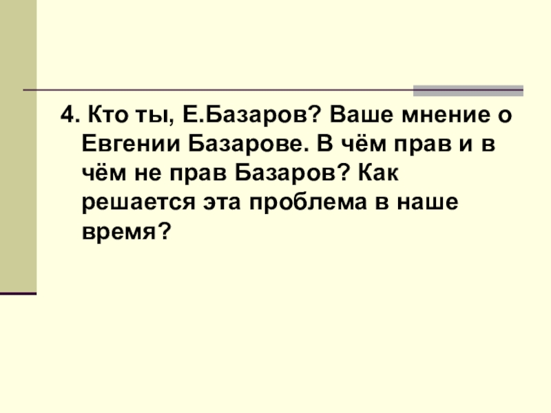 4. Кто ты, Е.Базаров? Ваше мнение о Евгении Базарове. В чём прав и в чём не прав Базаров? Как решается эта проблема в наше время?