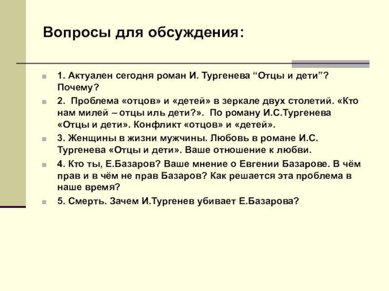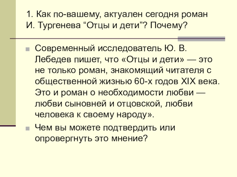 1. Актуален сегодня роман И. Тургенева “Отцы и дети”?