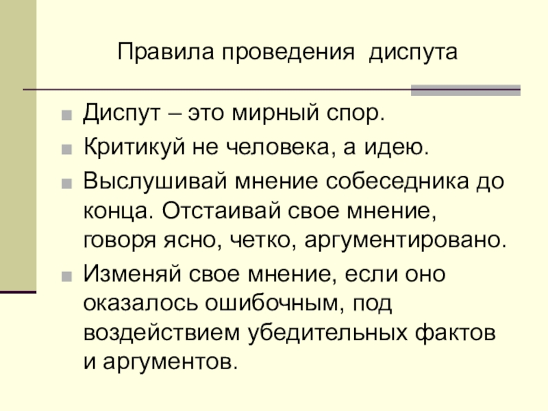 Выслушивай мнение собеседника до конца. Отстаивай свое мнение, говоря ясно, четко, аргументировано.