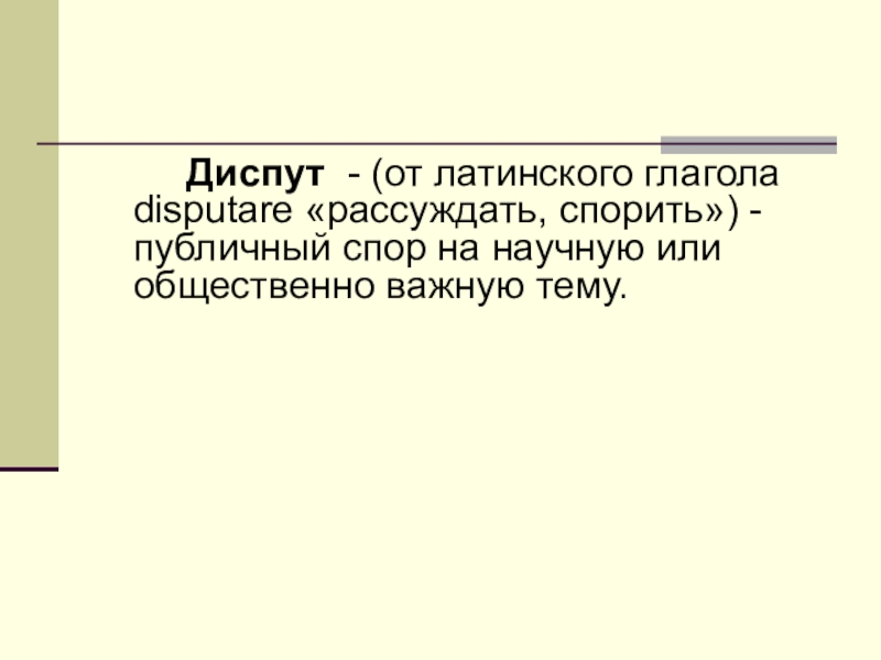 латинского глагола disputare «рассуждать, спорить») - публичный спор на научную или общественно важную тему.