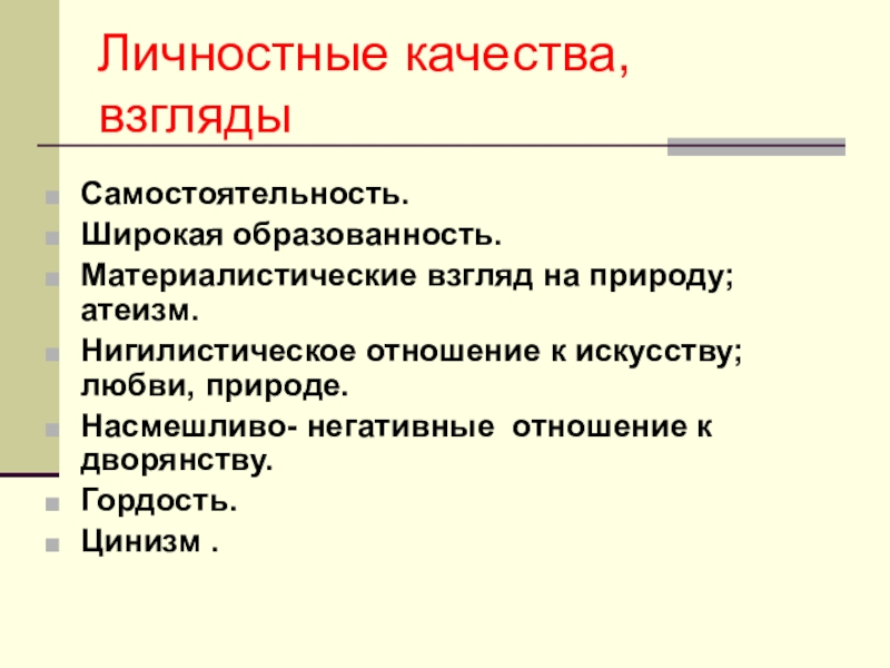 человек, Базаров увлечен естественными науками. Его политические взгляды сводятся к резкой критике существующего положения в стране: «исправьте общество, и болезней не будет». Созидание не считает целью: «Сначала нужно место расчистить». Этому посвятил всю свою жизнь. Красоту, эстетическое наслаждение отрицает начисто.