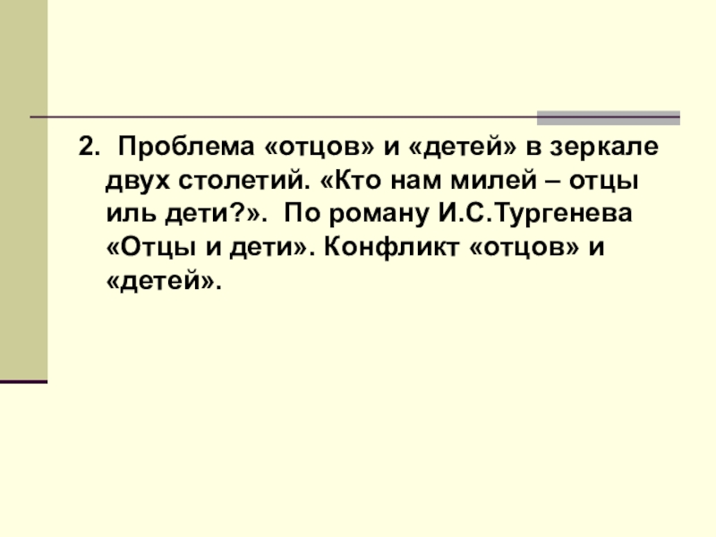 2. Проблема «отцов» и «детей» в зеркале двух столетий. «Кто нам милей – отцы иль дети?». По роману И.С.Тургенева «Отцы и дети». Конфликт «отцов» и «детей».