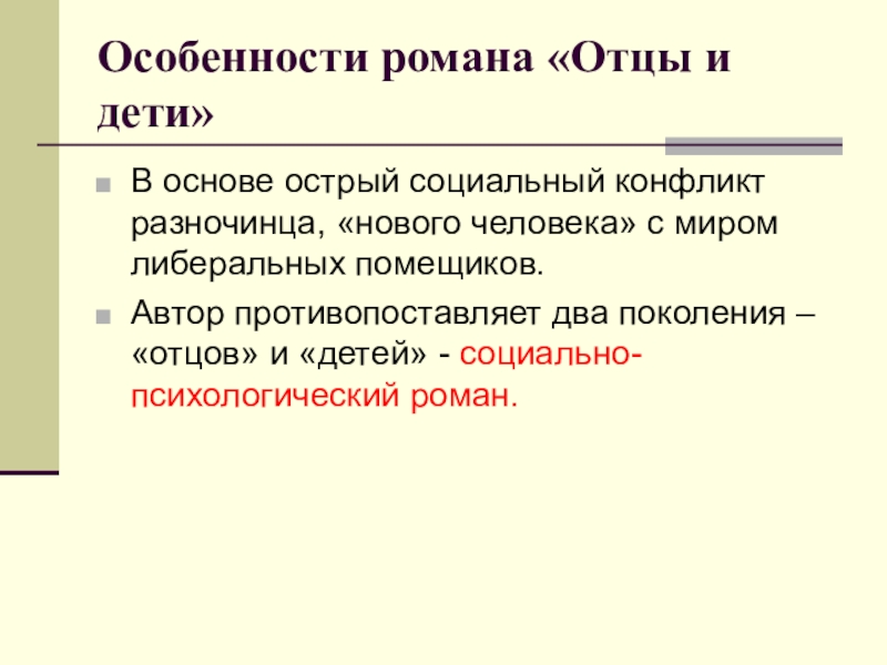 Автор противопоставляет два поколения – «отцов» и «детей» - социально-психологический роман.